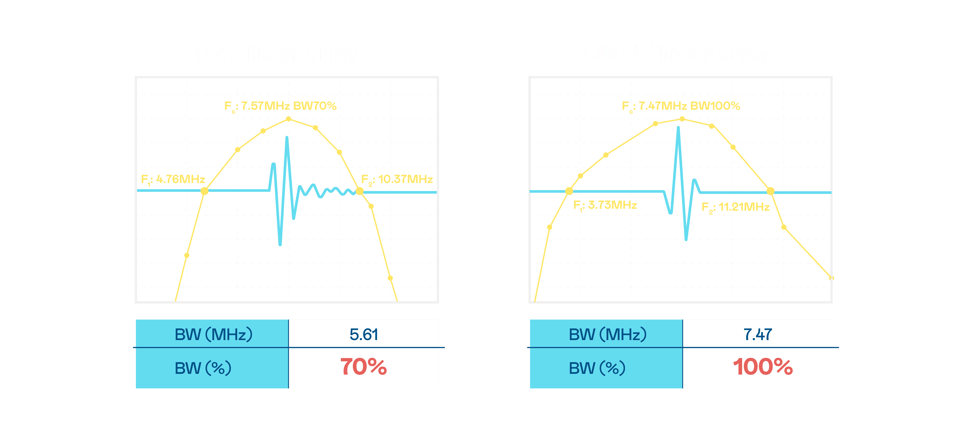 超音波影像的解析度高低,,,,首先取决于探头能发出的讯号频宽。。。蓝狮在线 CMUT 可提供高清晰的超音波讯号,,,提供高频宽、、、高灵敏度、、影像纹理细节更高的超音波影像,,,协助医护人员缩短影像判读时间及利用精准的医疗影像进行诊断。。。。